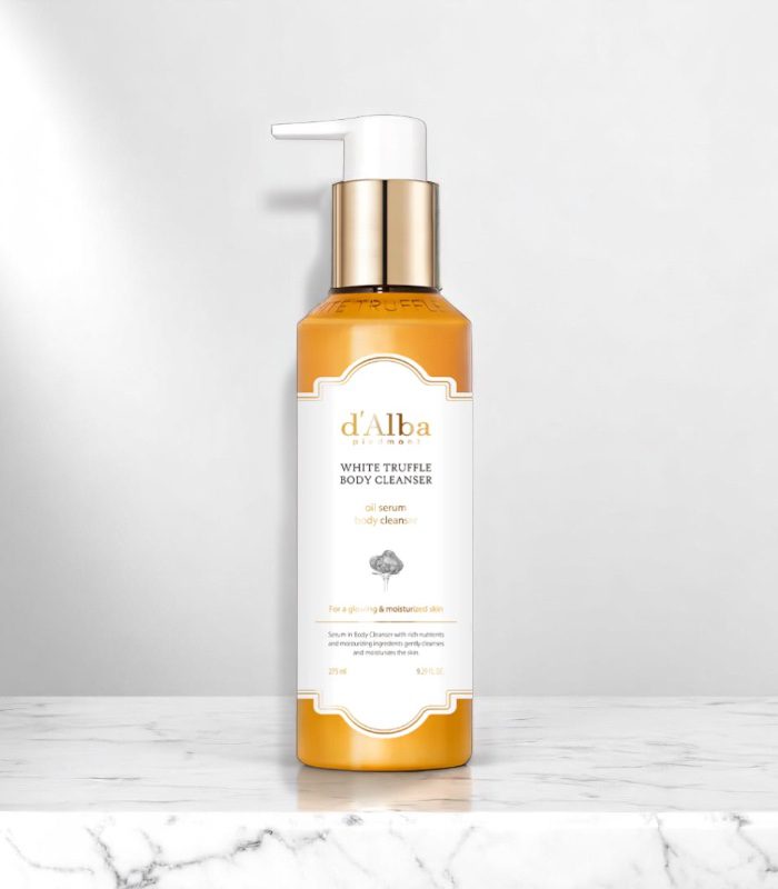 d’Alba – White Truffle Oil Serum Body Cleanser je prémiový tělový čisticí přípravek, který kombinuje účinné mycí složky s pečujícím olejovým sérem. Je obohacený o vzácný bílý lanýž z Itálie, výživné oleje a hydratační látky, které zanechávají pokožku hebkou, hydratovanou a zářivou.