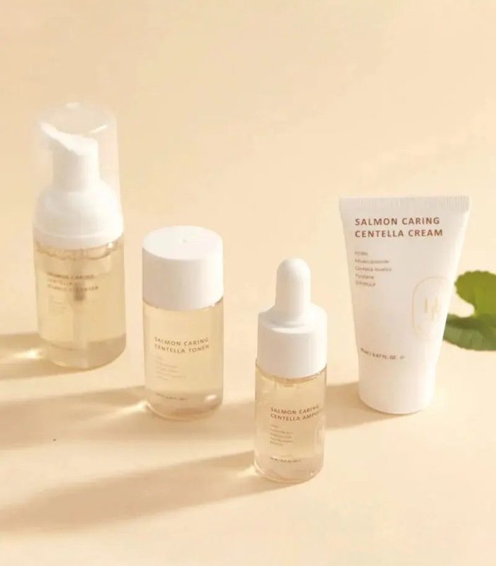 • Salmon Caring Centella Toner 30ml – Zklidňující tonikum pro obnovení rovnováhy.