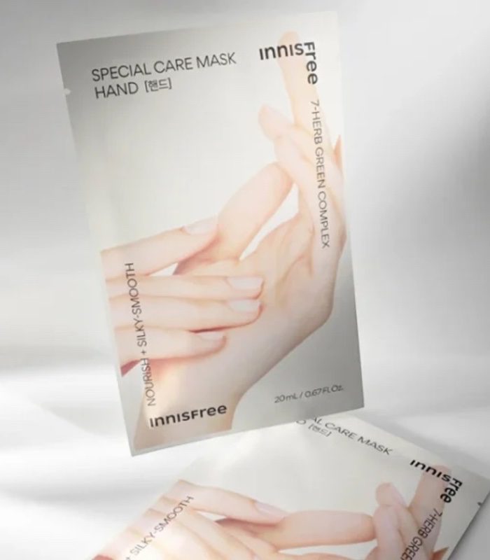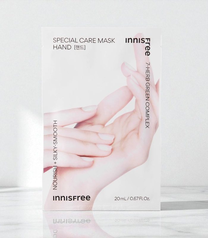 Innisfree – Special Care Mask-Hand je speciálně navržená maska na ruce, která dodává intenzivní výživu, hydrataci a regeneraci suché, popraskané a namáhané pokožce. Je ideální jako cílená péče pro ruce vystavené častému mytí nebo nepříznivým vnějším vlivům.