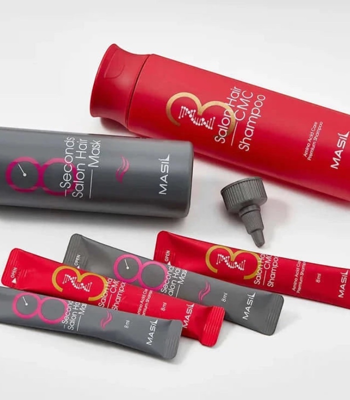 Masil 3 Salon Hair CMC Shampoo: Water, Sodium Laureth Sulfate, Cocamidopropyl Betaine, Ammonium Lauryl Sulfate, Disodium Laureth Sulfosuccinate, Decyl Glucoside, Glycerin, Sodium Chloride, Menthol, Phenoxyethanol, Polyquaternium-10, Guar Hydroxypropyltrimonium Chloride, Butylene Glycol, Cocamide MEA, Allantoin, Citric Acid, Disodium EDTA, Mentha Piperita (Peppermint) Oil, Houttuynia Cordata Extract, Angelica Gigas Root Extract, Centella Asiatica Extract, Glycyrrhiza Uralensis (Licorice) Root Extract, Polygonum Multiflorum Root Extract, Scutellaria Baicalensis Root Extract, Sophora Flavescens Root Extract, Morus Alba Bark Extract,Opuntia Ficus-Indica Fruit Extract,Paeonia Lactiflora Root Extract, Phellodendron Amurense Bark Extract, Plantago Asiatica Extract, Portulaca Oleracea Extract, Swertia Japonica Extract, PEG-7 Glyceryl Cocoate, 1,2-Hexanediol, Eucalyptus Globulus Leaf Extract, Hamamelis Virginiana (Witch Hazel) Leaf Extract, Lavandula Angustifolia (Lavender) Flower Extract, Melissa Officinalis Leaf Extract, Mentha Piperita (Peppermint) Extract, Salvia Officinalis (Sage) Leaf Extract, Sodium Acetate, Isopropyl Alcohol, Cynanchum Atratum Extract, Citronellol, Geraniol, Linalool, Fragrance. Masil 8 Seconds Salon Hair Mask: Propylene Glycol, Alcohol, Myristyl Alcohol, Water, Dimethicone, Steartrimonium Chloride, Salicylic Acid, Panthenol, Menthol, Cetrimonium Chloride, Butylene Glycol, Behentrimonium Chloride, Houttuynia Cordata Extract, Sophora Flavescens Root Extract, Scutellaria Baicalensis Root Extract, Polygonum Multiflorum Root Extract, Glycyrrhiza Uralensis (Licorice) Root Extract, Glycerin, Centella Asiatica Extract, Angelica Gigas Root Extract, 1,2-Hexanediol, Swertia Japonica Extract, Portulaca Oleracea Extract, Plantago Asiatica Extract, Phellodendron Amurense Bark Extract, Paeonia Lactiflora Root Extract, Opuntia Ficus-Indica Fruit Extract, Morus Alba Bark Extract, Salvia Officinalis (Sage) Leaf Extract, Mentha Piperita (Peppermint) Extract, Melissa Officinalis Leaf Extract, Lavandula Angustifolia (Lavender) Flower Extract, Hamamelis Virginiana (Witch Hazel) Leaf Extract, Eucalyptus Globulus Leaf Extract, Hydrolyzed Wheat Protein, Hydrolyzed Sweet Almond Protein, Hydrolyzed Soy Protein, Hydrolyzed Rice Protein, Hydrolyzed Rice Bran Protein, Hydrolyzed Potato Protein, Hydrolyzed Pea Protein, Hydrolyzed Oat Protein, Hydrolyzed Corn Protein, Hydrolyzed Barley Protein, Valine, Tyrosine, Tryptophan, Threonine, Serine, Proline, Phenylalanine, Methionine, Lysine, Leucine, Isoleucine, Histidine, Glycine, Glutamine, Glutamic Acid, Cystine, Aspartic Acid, Asparagine, Arginine, Alanine, Benzyl Alcohol, Citral, Fragrance.