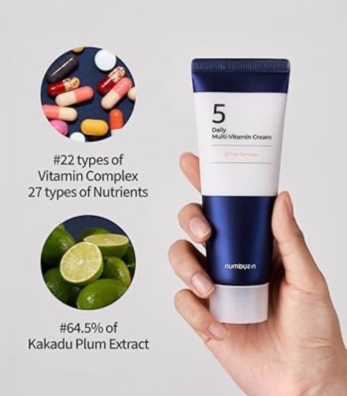 Numbuzin No.5 Daily Multi-Vitamin Cream je výživný pleťový krém s komplexem 22 vitamínů a 27 účinných živin, které podporují zdravý vzhled pleti a její každodenní regeneraci. Obsahuje vysokou koncentraci extraktu ze švestky Kakadu (64,5 %), která je bohatým přírodním zdrojem vitamínu C, a zároveň působí jako silný antioxidant.