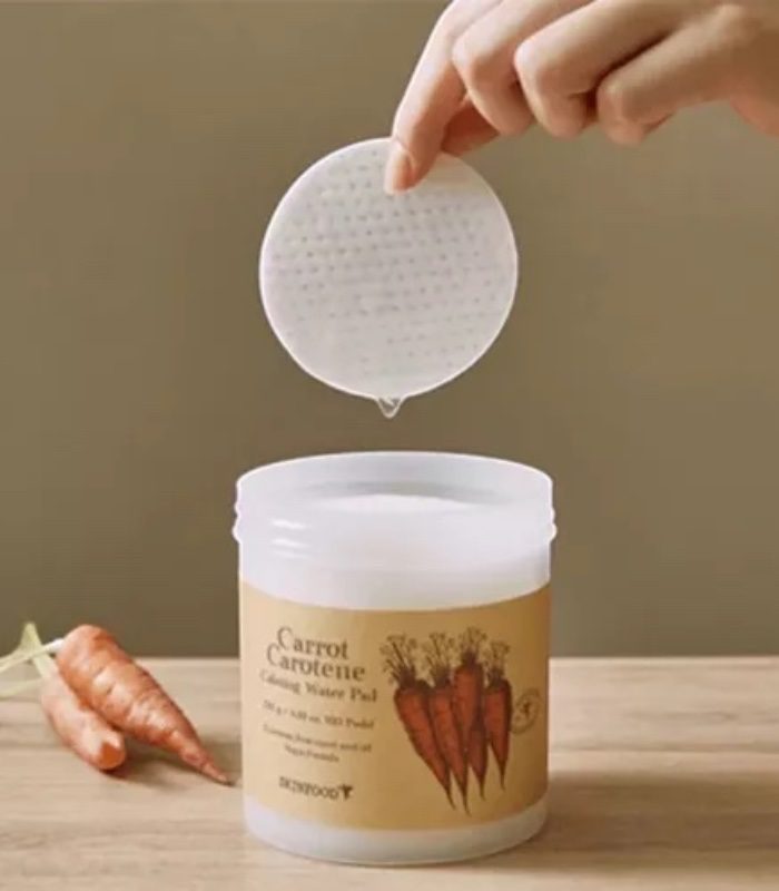Carrot Carotene Calming Water Pad značky Skinfood jsou unikátní hydratační a zklidňující tonizační tampony, které poskytují okamžitou úlevu podrážděné, zarudlé nebo citlivé pokožce. Jsou napuštěny bohatou esencí s extraktem z mrkve a mrkvového oleje, které obsahují vysoké množství beta-karotenu a antioxidantů. Tyto složky intenzivně hydratují, regenerují a posilují ochrannou bariéru pokožky. Texturovaný vatový tampon s jemným waffle vzorem minimalizuje tření a jemně klouže po pokožce.