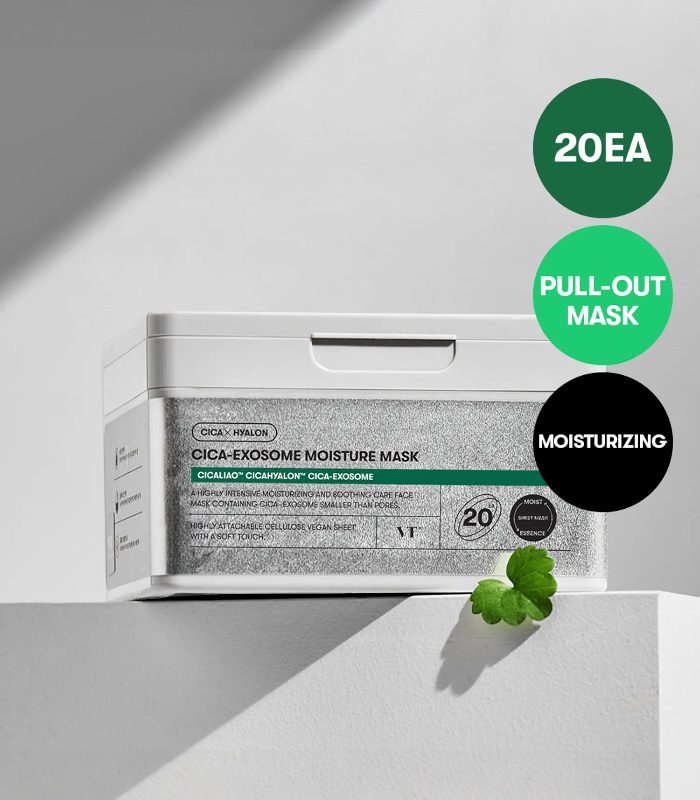 VT Cosmetics – CICA Exosome Moisture Mask je luxusní plátýnková maska, která kombinuje uklidňující sílu centelly asiatica (CICA) a pokročilou technologii exosomů pro hlubokou regeneraci a intenzivní hydrataci. Speciální struktura plátýnka zajišťuje dokonalé přilnutí k pokožce, díky čemuž se aktivní složky účinně vstřebávají a přinášejí okamžitý efekt svěží, zdravé a vyvážené pleti.